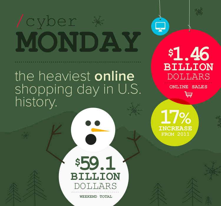 As in 2011, Cyber Monday once again broke the record for the heaviest online shopping day in U.S. history. This record-breaking day raked in $1.46 billion in online sales, an impressive 17% increase from last year. Online shopping also broke eCommerce records throughout the entire weekend - according to National Retail Federation, 27% of consumers shopped online on Thanksgiving and 47.5% shopped online on Black Friday, with Black Friday online sales reaching over $1 billion for the first time.