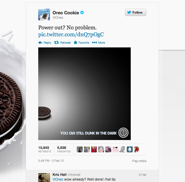 1) Oreo Cookie: “Power Out? No Problem” along with a picture of a cookie with the text “You can still dunk in the dark.”